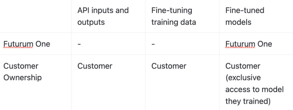 Your organization's uploaded training file is used exclusively to fine-tune a model, and is not used by Futurum One, or any other organization, to train other models. Outputs from fine-tuned models are not used to train your or any other models.While Futurum One retains ownership of fine-tuned models, they are exclusively accessible to your organization. Your organization's training files or fine-tuned models can be deleted at any time via an API call.